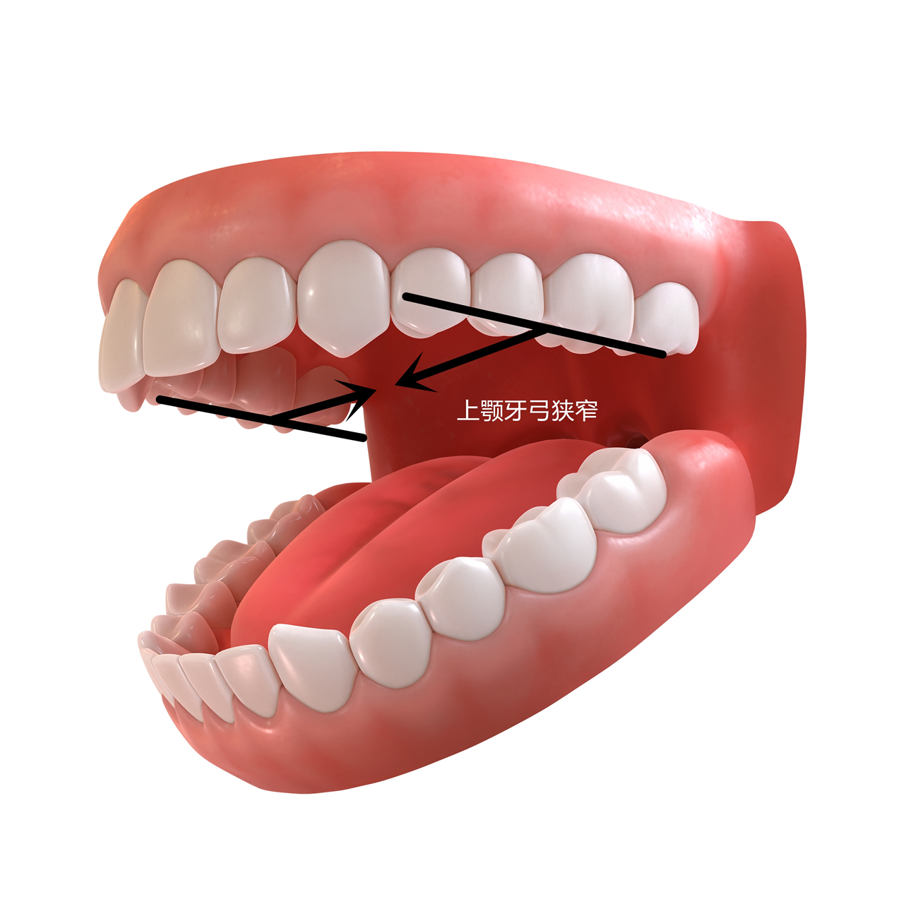 成因:1.呼吸:小孩如果有鼻炎,会经常出现口呼吸的习惯,口呼吸时嘴是张开的,颊肌力量会增加,舌肌往下,失去平衡,导致牙弓狭窄;2.吮拇指:小孩吮拇指,嘴是张开的,颊肌力量增加、舌头往下,导致牙弓狭窄。3.吃的食物较精细,颌骨缺少有效刺激,导致牙弓狭窄。4.发育畸形,比如唇腭裂患者,因为唇腭裂导致牙弓狭窄;5.外伤,同样会引起牙弓狭窄。