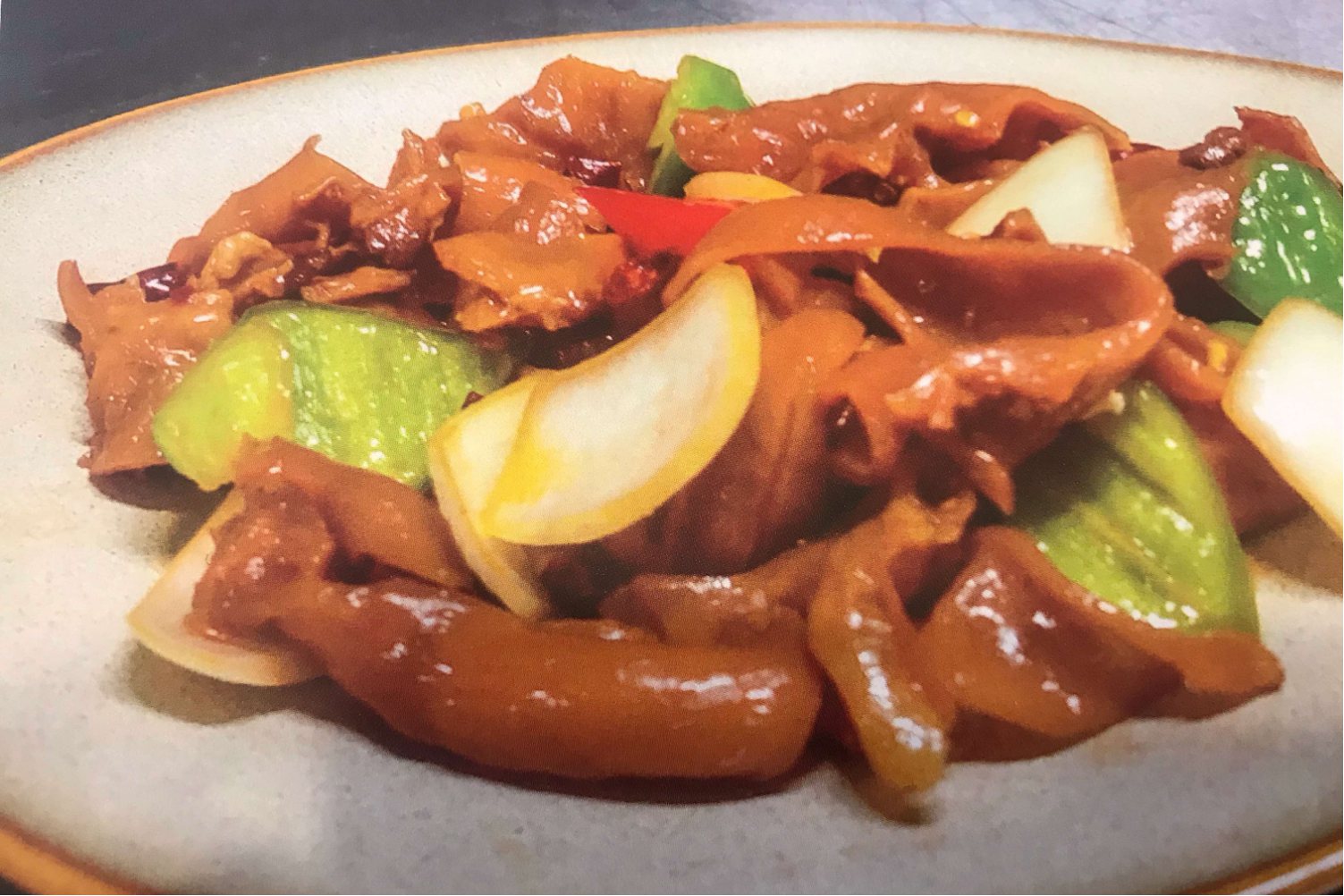 将护心皮洗净后切片放入炒锅中翻炒,加入调味料炒熟即可出锅。
