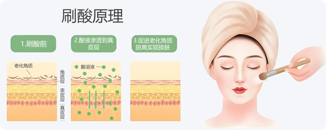 当刷酸应用于皮肤表面后,具体效果可能根据所用酸类的种类和浓度有所不同。详情如下: